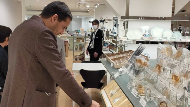ジョアオさんは柳宗理のキッチンツールやBALMUDA商品を手にとり、また日本の作家の陶器について担当の方に質問していました。
